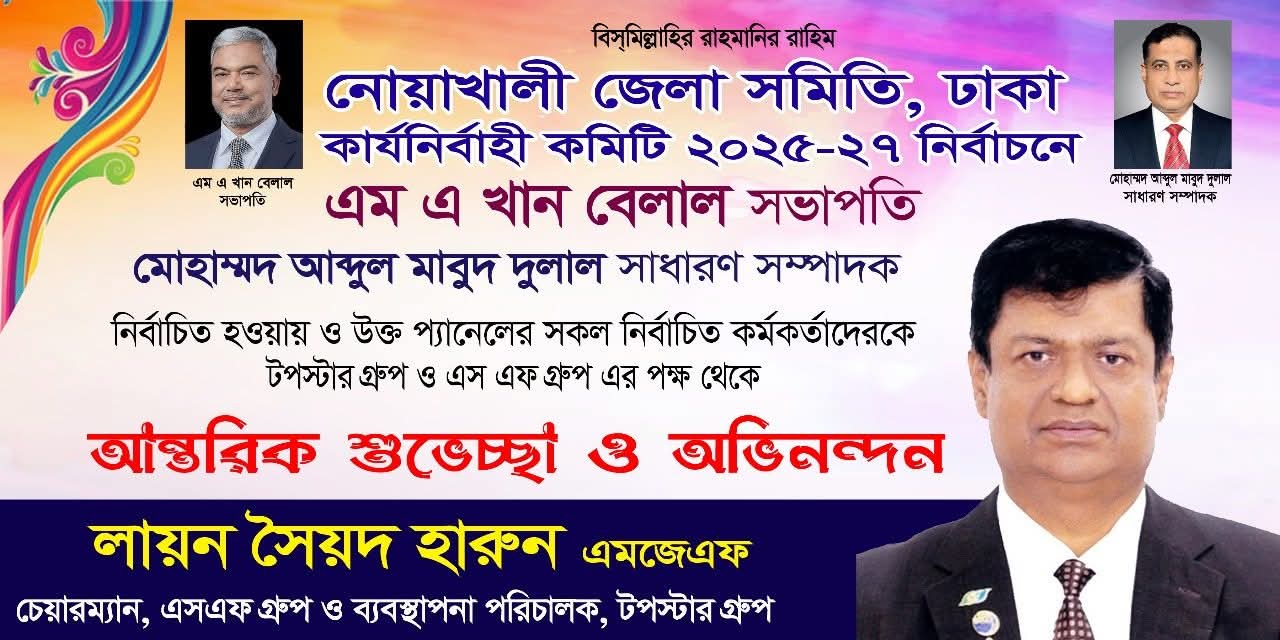 নোয়াখালী জেলা সমিতি, ঢাকা’র কার্যনির্বাহী কমিটি ২০২৫-২৭ এর নির্বাচনে সভাপতি পদে এম এ খান বেলাল এবং সাধারণ সম্পাদক পদে