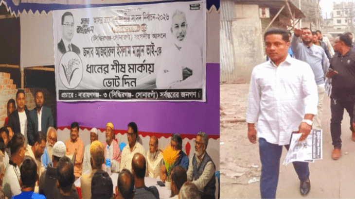 নারায়ণগঞ্জ-৩ (সোনারগাঁও-সিদ্ধিরগঞ্জ) আসনের বিএনপির মনোনীত প্রার্থী আজহারুল ইসলাম মান্নানের ধানের শীষের পক্ষে প্রচারণা চালিয়েছেন সিদ্ধিরগঞ্জের নাসিক ২ নং ওয়ার্ড বিএনপির